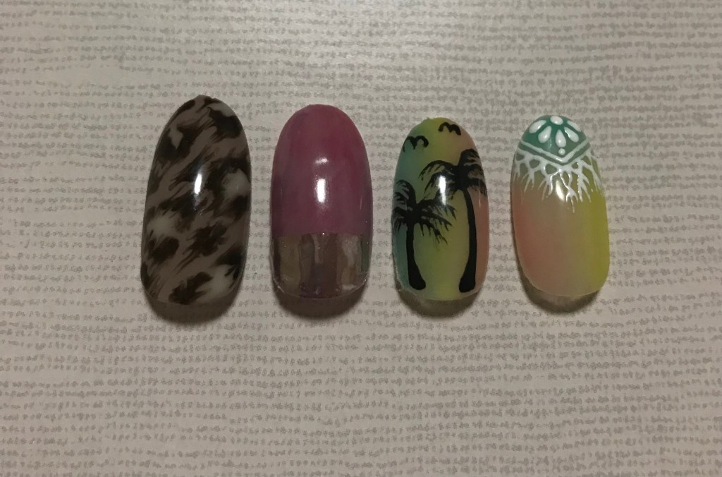 左からレオパード柄、部分ミラーデザイン、ヤシの木、タイダイ柄の上にフリンジ模様